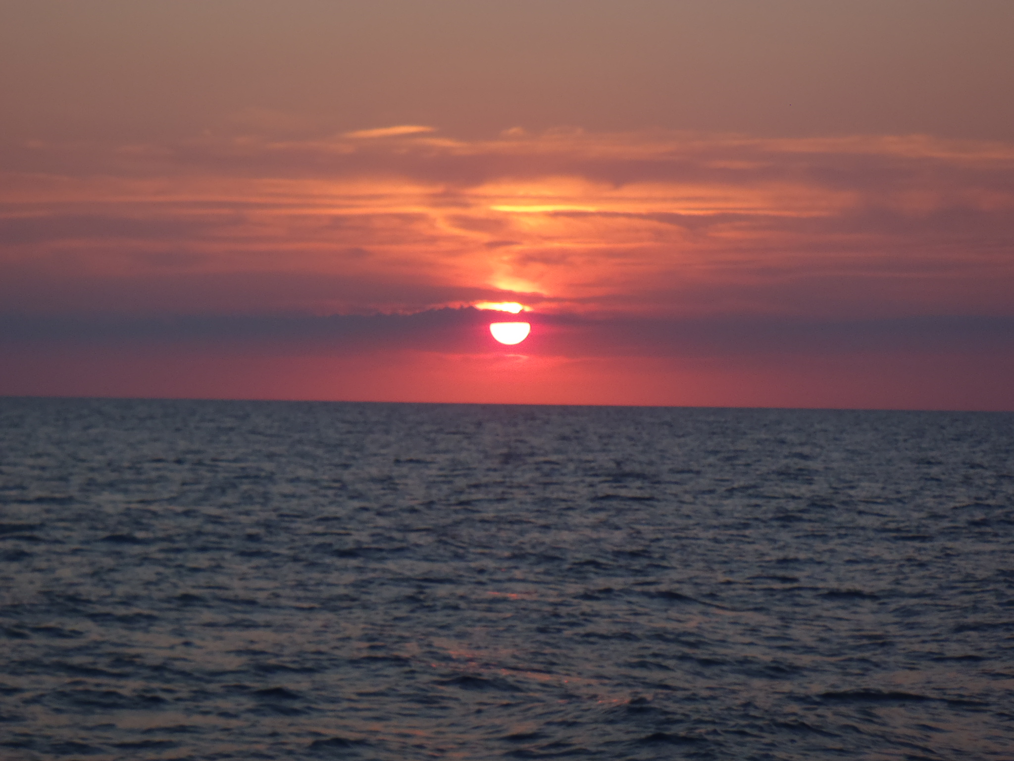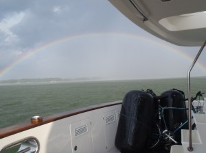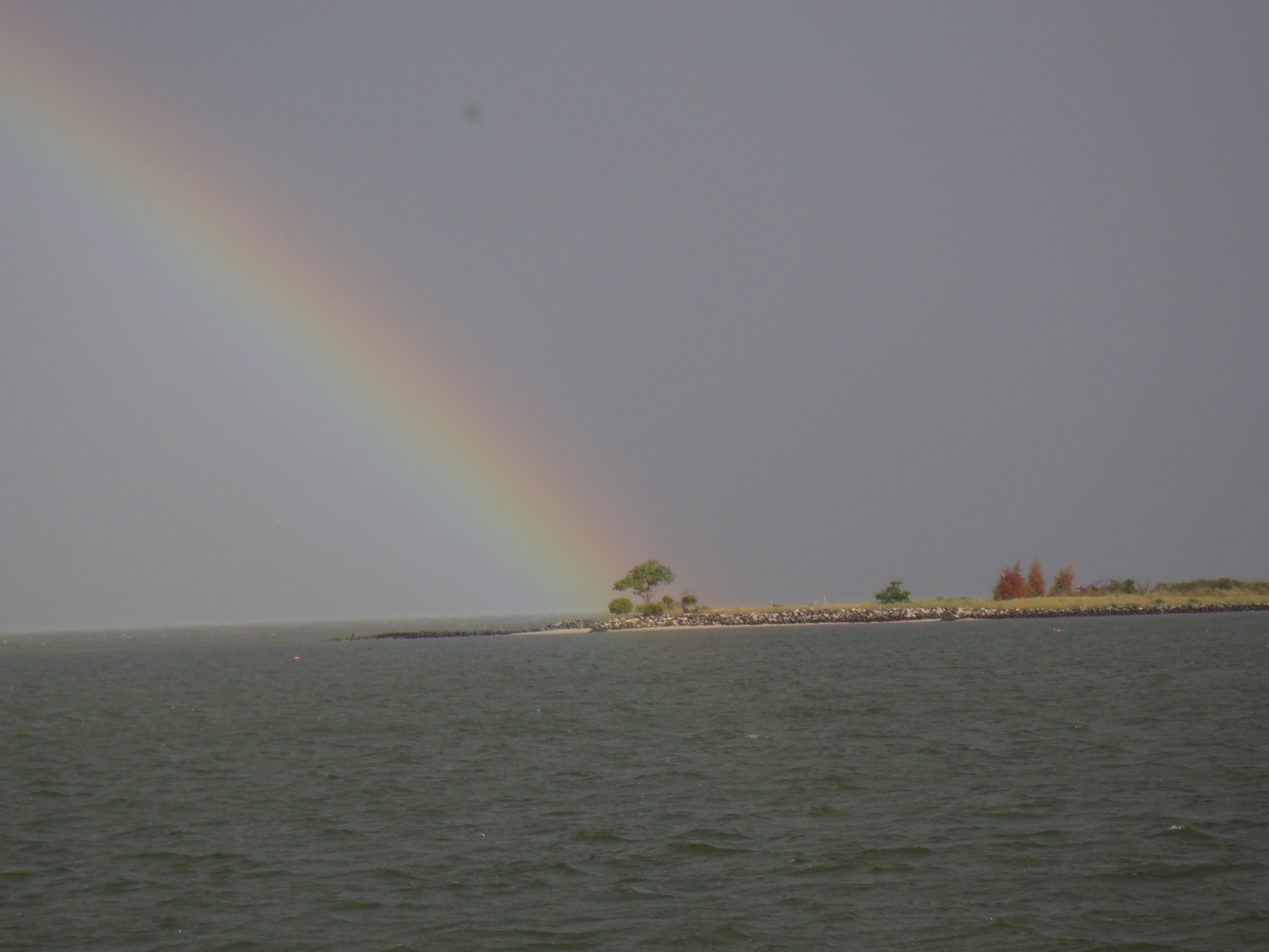 On Tuesday we were ready to depart. Our first stop Reedville, about 40 miles away. This will give us a chance to test everything, get our sea legs, then anchor for the evening in a peaceful spot. Our trip was very smooth – minimal winds and calm seas. Our anchorage was quiet and peaceful, great for a swim, though there were plenty of jellyfish about. After swims and showers, we were treated to a free boat wash, courtesy of a nice thunderstorm that left a breathtaking rainbow in its wake. It looked as if the rainbow was actually touching the water! We felt just like the pot of gold at the end of it. A great way to start the trip!
