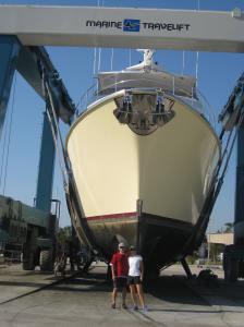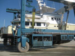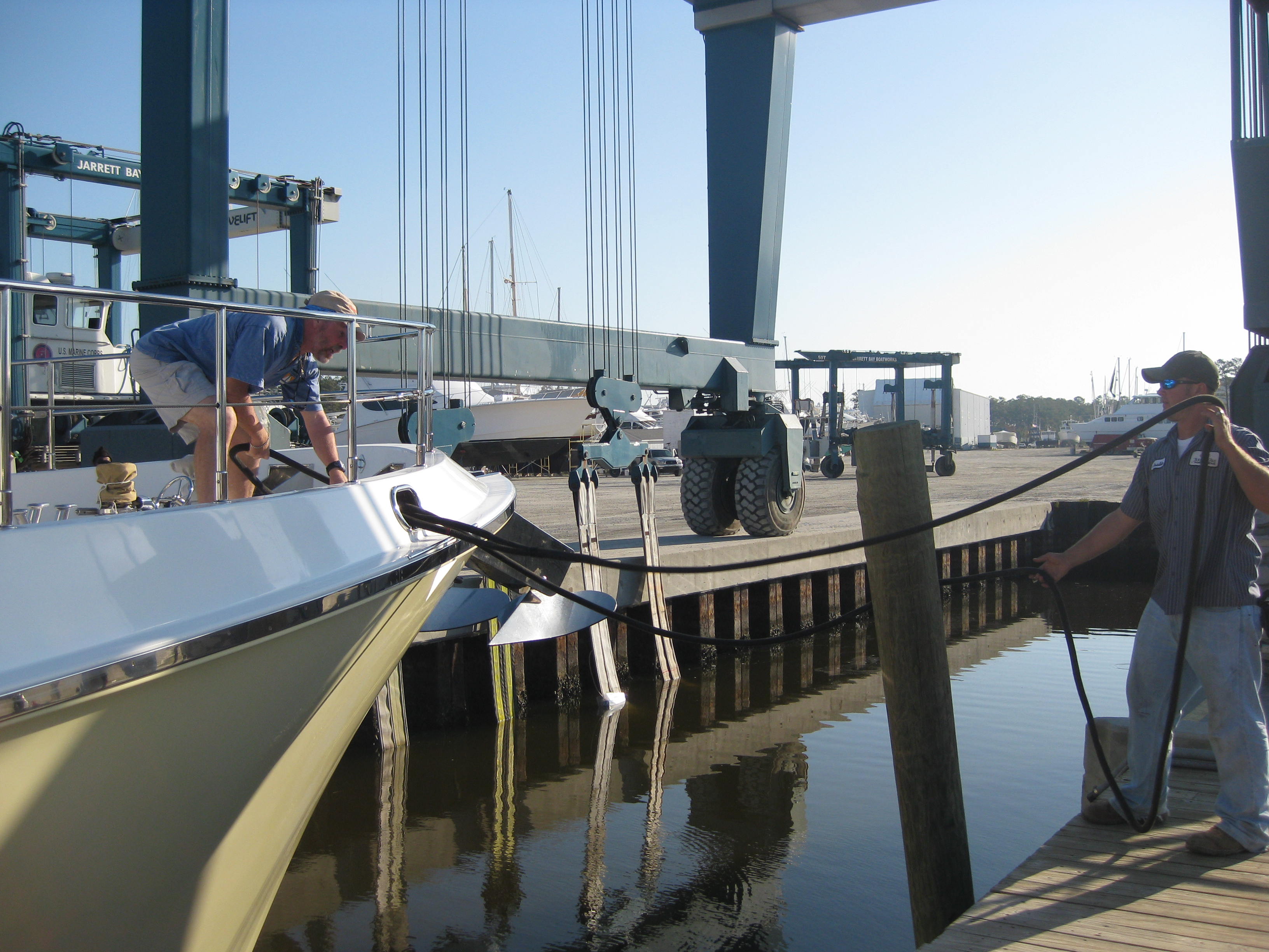 How do you haul a 250,000 pound boat out of the water? With a 200 Ton Travel Lift. It really is quite an impressive sight to see. At Jarrett Bay, they haul many boats a day and have a variety of sizes of travel lifts. We needed the big one! The boatyard has a haul-out dock where boats are first pre-positioned and tied alongside. Since the space is tight and we were still without bow and stern thrusters, we chose to move to this area early in the morning while the wind was very calm. The next step is to position the travel lift. This is a specially designed piece of equipment that straddles the loading bay. Lifting straps are then lowered into the water to a depth below the boats draught (in our case 8 feet). Then the boat is moved by hand, with a bunch of guys pulling lines until it is positioned on top of the lifting straps. Care must be taken that the straps aren’t positioned over the stabilizers, sonar, or other sensitive areas on her bottom. Once the boat is positioned, the lifting process begins. The boat is gradually hoisted until it is out of the water and the bow clears the top of the dock. Then the travel lift carefully and slowly moves the boat to the washdown area where she receives a nice bath with fresh water from a pressure washer. This removes much of the marine growth from the bottom. After the bath, she is moved to the space where work will be done and positioned on blocks – lots of them to hold her firmly in place.