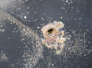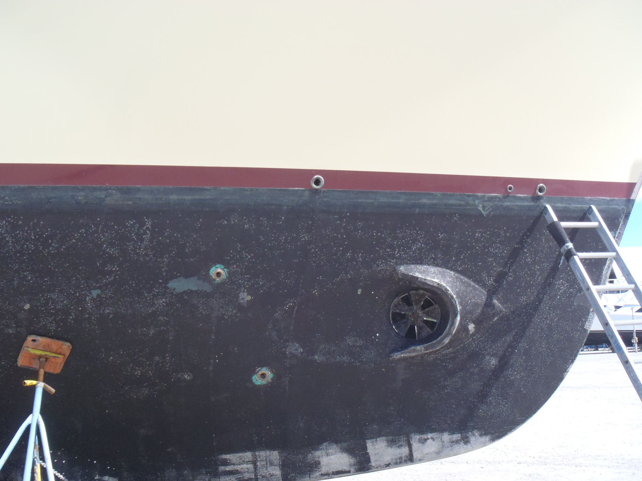 Power cords are then connected, a ladder is put in place to allow you to get on and off the boat (the deck at this point is 10 to 12 feet off the ground). Next, plastic floor covering is installed on all exterior decks and interior floors. Boatyards are very dusty and dirty places and protecting the surfaces is important. The boat is now ready for whatever work needs to be done. Our first step was to visually inspect the exterior of the boat, looking for anything out of the ordinary. Much like a bullet wound, lightning often creates more damage on its way out then on it way in. Our inspection did not reveal any obvious additional damage from the lightning nor any other unexpected findings. Next, we inspected and cleaned all the through-hull fittings. These are the places in the hull where a hole has been put in order to allow seawater to enter the boat – for example for cooling the engines or generators – or to allow “stuff” to leave the boat – such as exhaust, bilge pumps, or gray water (water from showers or sinks). Shear Madness has 37 different through hull fittings and these need to be periodically inspected as each one is a potential source of trouble should it fail or leak.