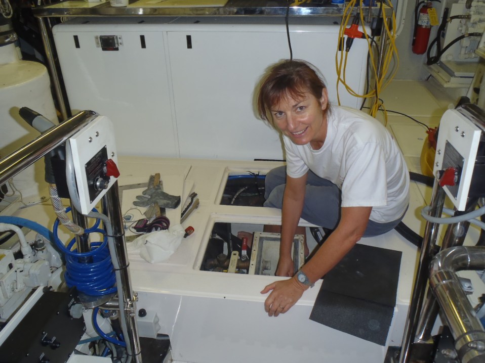 Leanne sanding in sea chest (engine room)