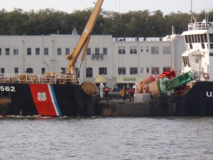 As night fell and we cruised along the Florida coast, the traffic increased. We passed several ships and tugs, including the Carnival Pride cruise ship, which it seems we pass on every trip up or down the coast! As dawn approached, we arrived at Palm Beach. We entered Ft. Worth Inlet and dropped our anchor so that the guys could dive and inspect and clean the bottom of the boat. They did this with great efficiency, pleased with how everything looked and giving the bottom a very gentle wipe to remove any burgeoning growth. We raised our anchor and continued on into Old Port Cove Marina where we will be for a few weeks while we wrap up our repairs.