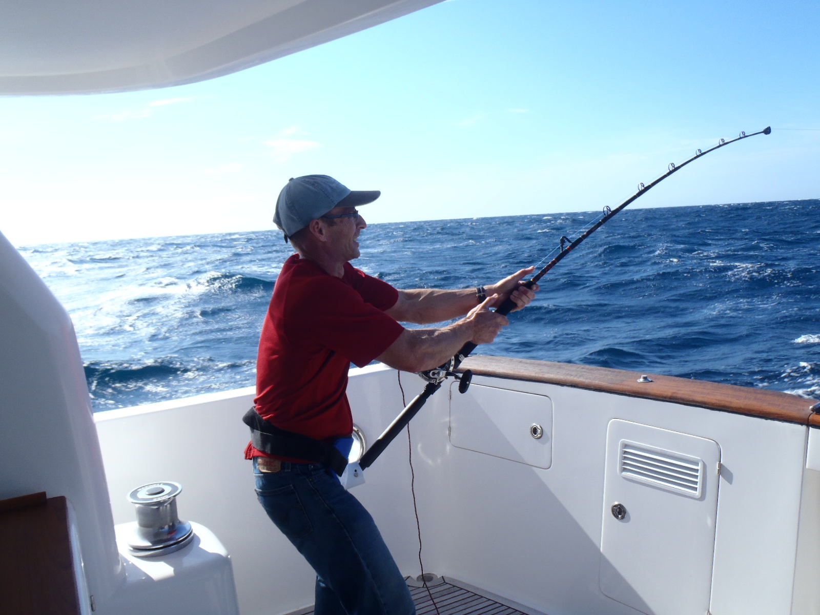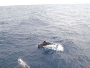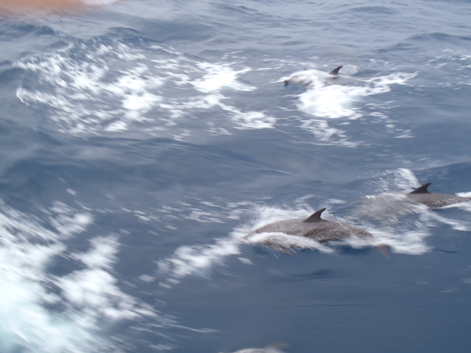 After an uneventful night during which we saw little traffic, we had some morning visitors – literally dozens of spotted dolphins that swam along with us for over an hour, frolicking in our bow wake and performing stunning acrobatics. No matter how often we see dolphins, we just never get tired of it! Next it was time to give the fishing poles a try. Out went the lines and then – nothing. Hours passed, the wind blowing about 20-25 knots, and waves building to 4-5 feet. Suddenly, we heard it – the fishing line making its distinctive noise! When we hook a fish, we slow the boat down in order to bring it in. Even a small fish is difficult to haul in at a speed of 8 knots! And this did not appear to be a small one. But when we slowed the boat down, the autopilot immediately sounded an alarm and lost its heading. Other alarms started going off. As we stopped our forward progress, the stabilizers lost their ability to hold the boat steady and the building waves started to rock us nicely. Mind you, the boat has no problem with this, but it’s amazing how different it feels to the crew when you’re getting knocked about. John was on the back deck trying to reel in a monstrous fish, with Leanne assisting, Bradley and I were trying to get our electronics settled down, and meanwhile several things in the galley and salon went crashing to the floor.