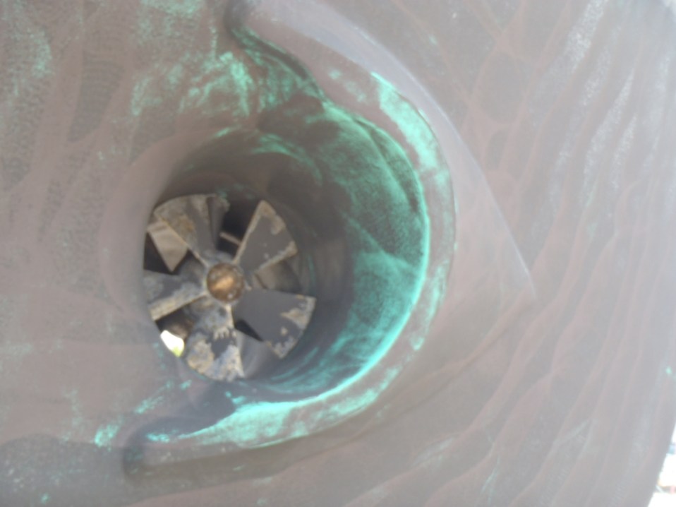 2012-07 Jarrett Bay and Cape Lookout » 05 Green bottom paint showing through near bow thrusters