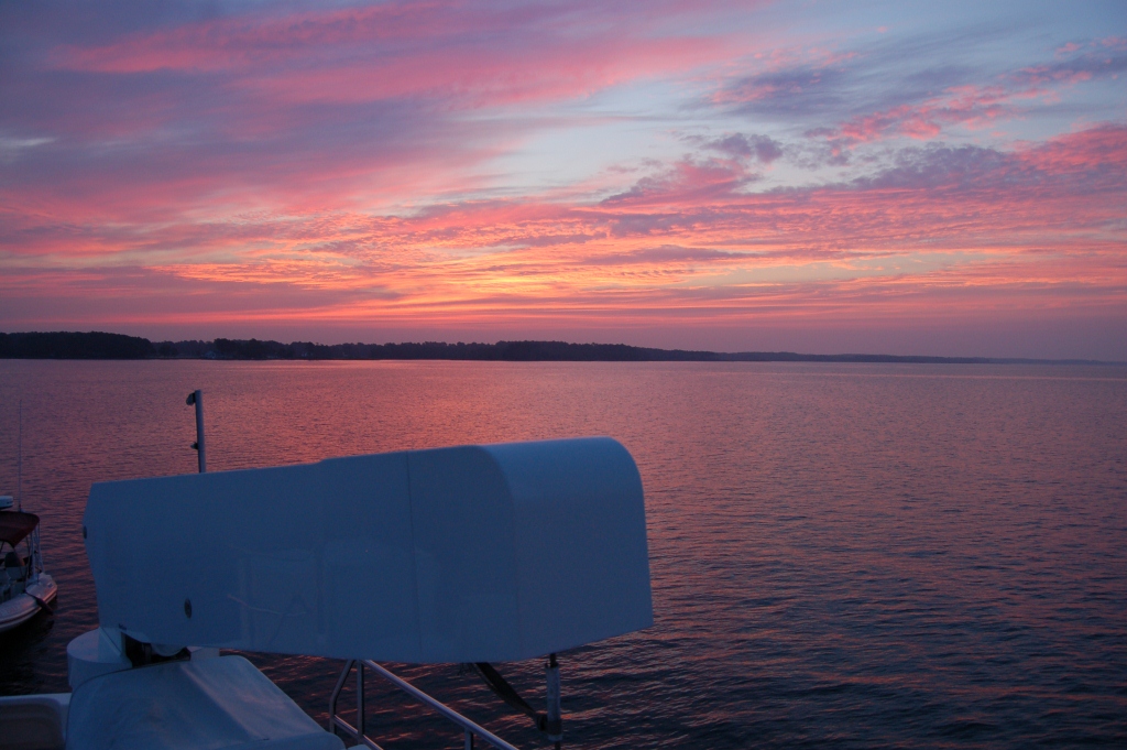 From the York River, we headed towards Deltaville, which is on a peninsula between the Piankatank and Rappahanock Rivers. We anchored in Hill’s Bay in the Piankatank. We have some friends, Gary and Patti who live a ways up the Piankatank and they came down in their boat for drinks and dinner on board. While out exploring in our tender, we also met Maxine and Michael, who it turns out own the house we were anchored in front of. We invited them over for drinks they next day (they arrived just after a nice storm blew through) and went to dinner at a local restaurant on Gwynn Island – excellent food! Just as we were leaving for dinner, another local came by in his boat on his way to watch the sunset. His name was Richard and he and his wife Vera invited us to his home for dinner – what a treat as Vera is a gourmet cook! We also left with bags of fresh basil and chives from their garden. We had another dinner invitation from Maxine and Michael to go to their house, where we were able to keep an eye on the boat during another storm.