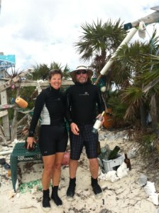 As usual, we were working on projects right up to departure time. The good news is that this gave us time to catch up with some more friends. Richard came over from Naples to help with a couple of woodworking projects and to bring us our mail. We were also able to see Doug and Eloise, who have just purchased a house in the area for dinner before we left. On Saturday, Dec. 15th in late afternoon we headed to the fuel dock to top up with over 1000 gallons of diesel fuel. Then we had a nice dinner aboard before a good nap. As the tide rose, we departed the fuel dock at 10pm for the overnight crossing to West End. Our speed was a little slower than normal as we crossed the gulf stream, averaging just under 7 knots. We arrived at West End on Grand Bahama where we stopped long enough to clear into Customs and hoist our Bahamas courtesy flag to signify legal entry into the country. Then it was off again straight to the Exumas. Once again, our speed was slower than normal as winds and current were against us. We made it to Big Majors, our anchoring spot, just before sunset on Monday the 17th. The next morning was spent washing and cleaning the boat before picking up our friends from Colorado, Alan and Kathleen, at the “airport” (actually just a small airstrip with a little hut).