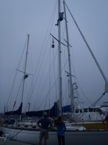 Weather conditions were good, with light winds but fog set in just before our arrival at the Royal Nova Scotia Yacht Squadron. It was so thick we could not even see the docks and since it was a tight fit for us to get in, we anchored until the fog lifted enough to see where we were going. We docked with no problems and soon discovered a little hitchhiker – a small bird had somehow got itself stuck in the space between the aft step and the door. He seemed a little confused but after we opened the door and he sat for a few minutes to collect himself, he flew off.