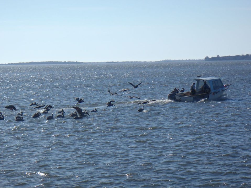 2014-03 Passage to the Abacos » Pelicans catch a ride on a fishing boat