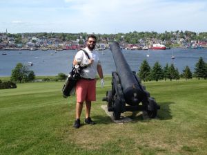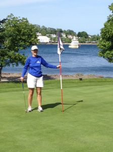 - Kathy at the Bluenose Golf course in Lunenburg with Shear Madness at anchor