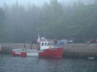 Soon we were through the canal and glad we had a track to follow to our anchorage at Little Harbor. We had been there last year and our navigation software keeps a record of our previouse “tracks”. As the fog was still heavy, visibility very poor, and the channel a bit tight with some narrow passages, we were navigating mostly by following our previous track with everyone keeping a keen visual watch to identify every marker and every blip spotted on the radar. We arrived safely at our anchorage and soon were securely anchored in a good spot. All that remained was to cook the lobsters! Although it was a nice evening, the flies were out in full force and they bite as if they are starving, so eating outdoors was not an option. Thus, we had to prepare the salon for lobster eating, which was accomplished by spreading out a large work blanket below our table and a sheet as a tablecloth to catch any flying bits of shell or meat. It worked great and Chef Bradley cooked the lobsters to perfection. Half were eaten with the rest safely secured in the fridge for another day.