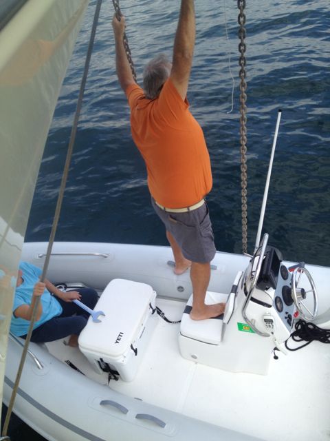 Brad helps with the anchor roller (see the wrench on Lorraine’s lap)