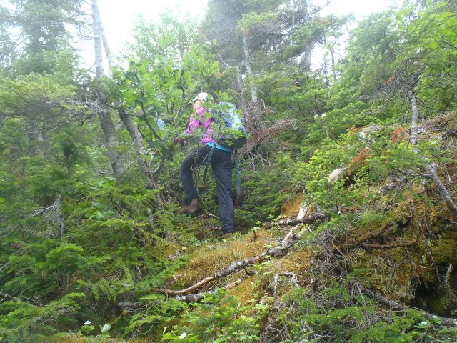 2014-07 Labrador – Icebergs and Beauty! » Marci bushwacking at Eagle Cove