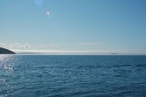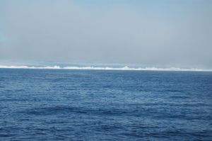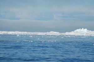 It took us several hours and lots of very difficult navigation attempts to come to the realization that Ice Class boats are built from Aluminum or Steel incorporating special designs for a reason. After poking our way north along the ice front and trying several times to turn east and find a passage into Ilulissat, we were stymied first by ice and then by fog. Even with our radar accurately showing any decent size piece of ice, without the ability to see more than a hundred meters in front of us, navigation was extremely difficult, not to mention stressful. Besides the massive icebergs and their little brothers, medium sized bergs, the water is simply covered with small bits of floating ice, ranging in size from small chunks to large blocks, some of which can cause damage if hit. These “growlers” or “bergy bits” do not show up on radar, and create a real obstacle course. As the fog intensified, it became more and more difficult to see these bits of ice.
