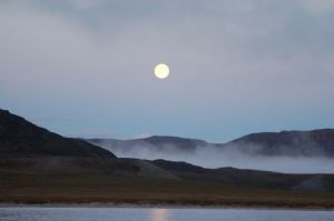 It was 10:30pm by the time we were anchored and settled but the sun was still well above the horizon, while a beautiful full moon was on the rise. Just when we thought all was well and had settled in for a well-deserved sleep, we heard a sound so loud and close, one would have thought the boat was breaking apart. We all jumped out of bed and after carefully looking around, we realized the large iceberg, sitting just outside our anchorage bay was calving. It is amazing the amount of sound emanating from the ice as we passed it. As the ice density increased, so did the noise level, to an almost distracting decibel level. Because sound travels so much further through water, than air, one can hear the icebergs singing to each other as they slowly shrink. In the morning, we saw that the arch/tunnel we had seen just hours before was obliterated! Glad we had not seriously considered launching the kayak!