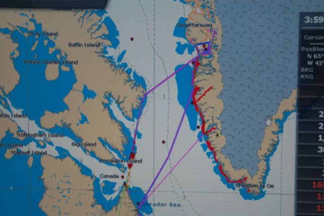 Let me back up a little. We departed Greenland at 04:00 Monday 25 Aug. for Baffin Island. Based on the weather and conditions, we elected to cross almost due west and then run down the coast of Baffin Island, so we could seek protection when the weather required.