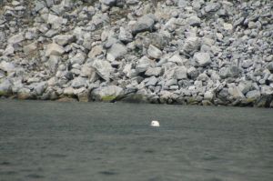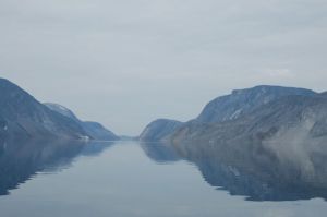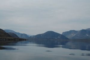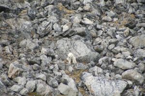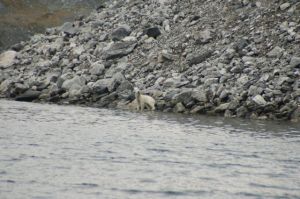 After a few tries we were able to get ashore and secure the tender in a way that it would not end up high and dry on a dropping 2.5 meter tide. We went for a wonderful 2+ hour hike up a hill. It was the first time we had been off the boat since Sunday in Aasiaat. While we did see some signs of wild life, like some huge hoof prints, signs of field mice and some animal scat, no polar bears were seen. We decided to return to the tender to explore a second arm of the bay that went several miles deep into the mountains. As we are heading over there, we noted a white fishing float bobbing in the water and decided to pick it up. As we headed there, we realized it is moving – and Kathy grabs her camera thinking we have spotted a white seal! Just about that time, it turns its head to look us in the eye and we realize we are seeing a Polar Bear swimming around looking for dinner. We back off the throttle, but he decides to head for the near shore, where Kathy successfully snaps some pictures.