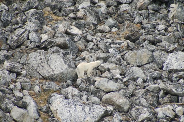 So as not to bother him, but be in a position to watch him for a while we decide to circle far away from him and end up near where he is heading, to just sit and watch quietly. Just as we are approaching shore, and getting ready to kill our engines, what do we spot – a mother and 2 cubs, moving very smartly up the hill. They had clearly seen, heard or smelled us coming, before we saw them. We were very impressed by just how fast all three were able to scamper over the large boulders and move up the hill. This clearly reinforces the warnings – humans cannot out run a polar bear. We watched them move up the hill, while our first bear continued to come towards us on the shore, before seeing us. After studying us for a short time, he simply climbed a little higher and continued on his course.