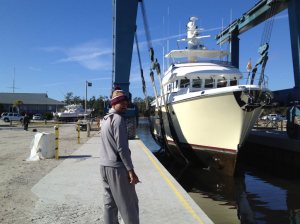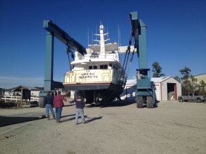 Upon returning to the boat it was time to head south to Beaufort, NC where we planned to haul the boat out of the water for a few months of maintenance and for us to spend some time in Colorado. Just before we were to leave, fellow Nordhavn owners Bob and Jan on the 57-foot Emeritus pulled into Tidewater Marina. They are an amazing couple – still handling the boat on their own well into their 80’s. We enjoyed a wonderful dinner out with them. It looked like we had a good weather window on New Year’s Eve, so we departed to head around Cape Hatteras and on to Cape Lookout. Conditions were ideal and we enjoyed our New Year’s Eve at sea, as we were able to see a few fireworks displays on shore. We also saw plenty of dolphins – Kevin’s first time seeing them up close! We also saw several whales. We made it to Cape Lookout where we anchored for the night before heading to the Beaufort Town Docks for a few days before moving to Jarrett Bay for our haul out. Soon the boat was safely out of the water and we had moved all our food, clothes, and various other things into the house we rented in the nearby Sea Gate community where we have stayed before.