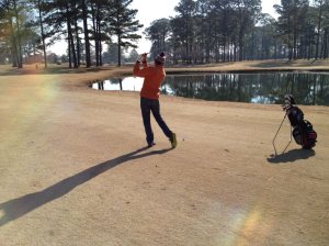 Our friends Gary and Cookie invited us to a holiday party at their home and it was a wonderful event! It was mostly work colleagues of Gary with lots of children. Good food, fun people, and some games and singing Christmas Carols made for a great time. Gary was also kind enough to invite me and Kevin to attend a basketball game at Old Dominion University. Front row seats no less! It was a great game – ODU won handily – and I made friends with the mascot! We also met up with another of my step-gransdons, Brian, who was working for the week in nearby Chesapeake, VA. Kevin and I also had a chance to get out for a round of golf.