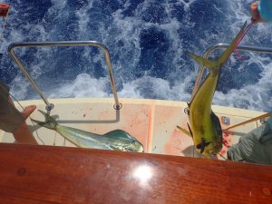 Speaking of which, the fishing has been great! On the way from Half Moon to Cat Island, we got a strike on one of our lines. It was my turn to bring the fish in and Austin was bringing in the second line to get it out of the way when he also got a strike! So we both had big fish on the line – his a 28 pound mahi and mine an 18-pounder. Spearfishing has also been good, netting some nice grouper and snapper.