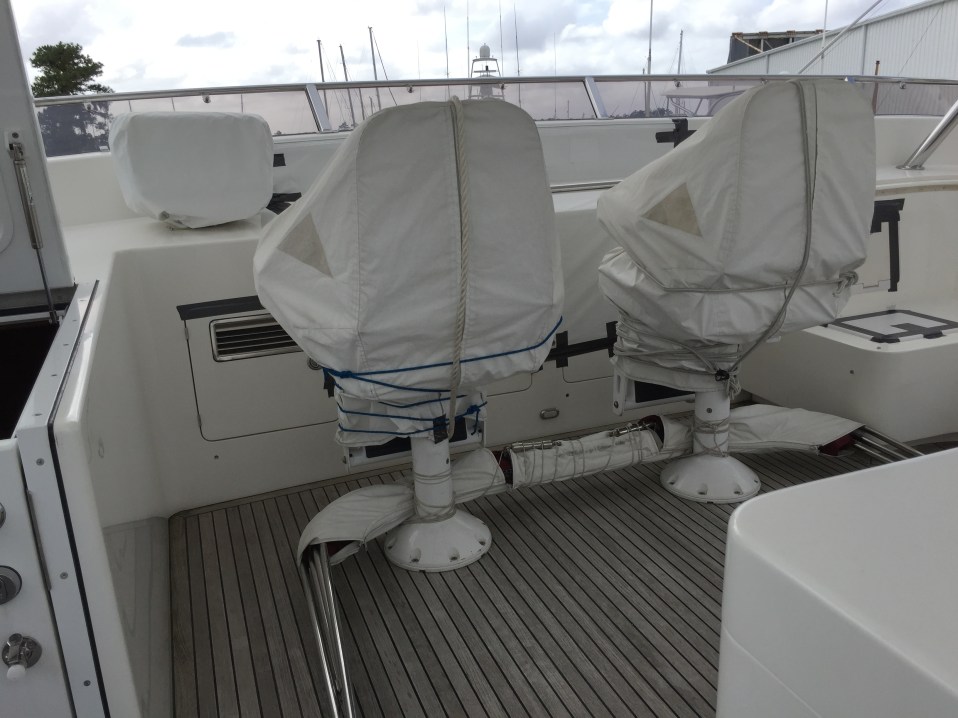 Tender’s bimini top (awning) stored under chairs, chair covers secured with tie downs