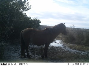 My friend Pam volunteers to keep an eye on the wild horses at nearby Rachel Carson Reserve and invited me to join her in servicing the cameras used to track the horses. This involves a bit of hiking, retrieving cards from the cameras, replacing batteries, and ensuring the cameras are placed in spots that will produce good info and secured so that they remain operational for several weeks. The cameras are motion activated and capture not only horses, but a variety of other wildlife including raccoons, foxes, rabbits, and more.