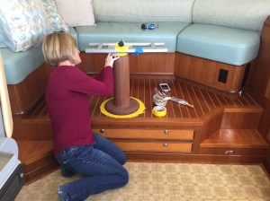 After exchanging multiple calls, a welcome call came in. Jarrett Bay would be able to haul us after all. What does that mean? Everything that can be impacted by hurricane strength winds (cushions, covers for kayak and tender, etc) has to be removed from the decks and stored safely inside the boat or in some kind of secure storage. Antennas have to be secured. Selected outside cabinets need to be taped to prevent water intrusion in heavy, pounding rains. The goal is to have as few wind resistant objects outside as possible.